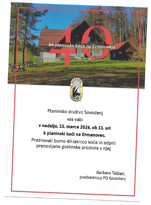 Dobili smo vabilo PD Sovodenj za praznovanje ob 40 letnici njihove koče na Ermanovcu, ki so jo v zimskih mesecih tudi prenovili in se jim želimo pri praznovanju pridružiti!